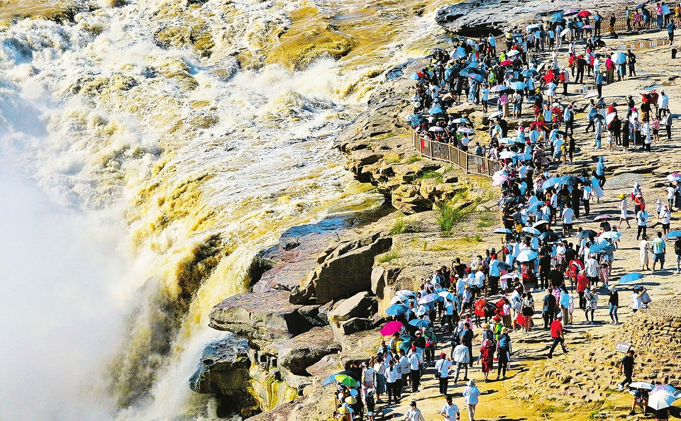 8月20日,游客在吉縣黃河壺口瀑布游覽觀瀑。近期,黃河壺口瀑布水量增大,形成綿延200余米的特大瀑布群景觀,氣勢(shì)磅礴,吸引了眾多游客前來(lái)感受瀑布和黃河的雄渾之美。