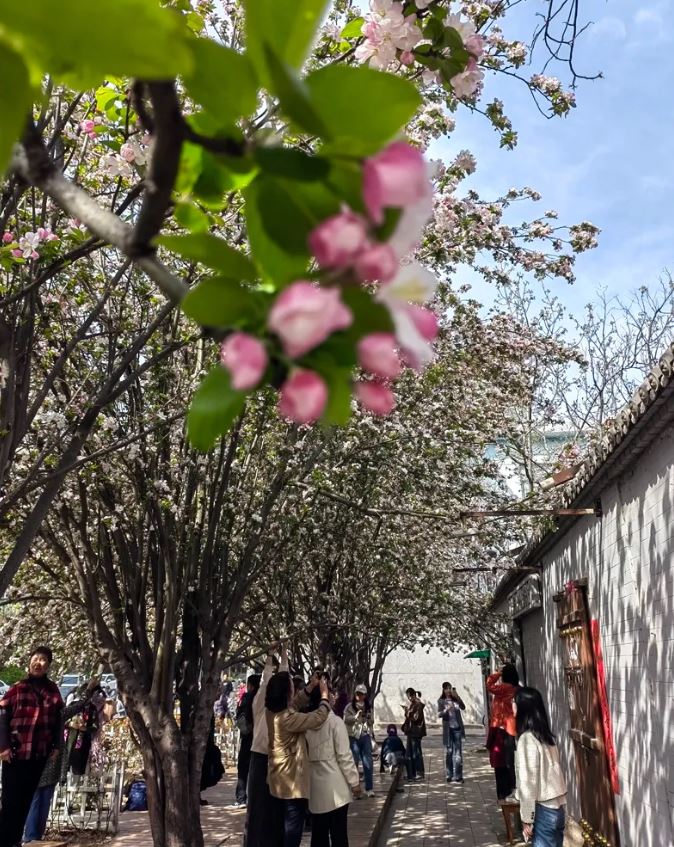 “一朵海棠露春芳,一樹海棠春滿堂?!薄斑@個(gè)路牌也太春天了吧,趁著春光明媚,帶上相機(jī)來打卡吧?!薄斑@幾天,這里成了最浪漫的打卡地,喜歡拍照的,趕快去吧!”杏林七條海棠花綻放,從去年海棠盛開時(shí)就火爆出圈,幾十米長的小巷總能看到游人如織的場景,這處隱匿在鬧市中的花海如此熱鬧,許多市民都是看到短視頻后慕名而來,希望與這片美麗花海來一次親密接觸。