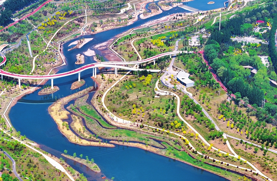 5月19日,俯瞰汾河四期濕地公園,草坪綠意盎然,花海濃烈絢爛,汾河水清涼怡人。從整體到細(xì)節(jié),從視覺(jué)到聽覺(jué),公園河景與岸景融為一幅色彩斑斕的夏日美景,讓人流連忘返。