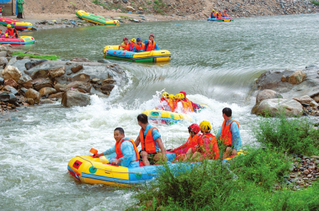 體驗(yàn)完水上樂園后,張子良一行乘車來到位于中莊村的龐泉溝激情漂流。剛下車就看到了碼頭上熱鬧的景象,一艘艘漂流艇上坐滿了前來體驗(yàn)的游客,大家穿著救生衣在工作人員的護(hù)送下向下漂流。偶爾遇到一處急流險灘,漂流艇隨著奔騰的水流飛馳而起,一眨眼的工夫就已落到了下一個平潭區(qū),游客們發(fā)出了陣陣尖叫。一路刺激,一路驚心,漂流給游客們留下了深刻的印象。負(fù)責(zé)該項目的閔玉貴介紹,項目選取了文峪河最精華的10公里河道,累計落差130米,平均水深0.8米,河道時寬時窄,水流時急時緩,沿途既有急流險灘,又有緩流碧潭,由于經(jīng)過了精心設(shè)計,且河道兩岸安排了上百名安全員護(hù)航,可以確保有驚無險。