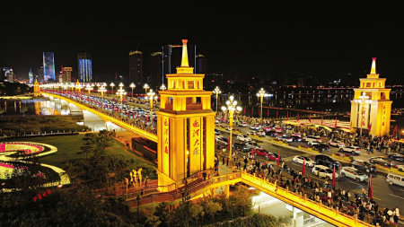 夜幕下新近改造的迎澤大橋宛如一條被紅色點(diǎn)亮的巨龍,橫臥在波光粼粼的汾河之上。金色的欄桿、飄動的五星紅旗、耀眼的中華燈裝扮出濃濃的節(jié)日氛圍,從四面八方趕來的人們漫步橋上,頻頻舉起手機(jī)拍照留念。