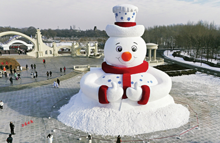 12月8日,哈爾濱今冬第一個大雪人“雪人先生”在太陽島風景區(qū)落成。大雪人高20米,用雪量4000立方米。圖為12月9日在哈爾濱太陽島風景區(qū)正門廣場拍攝的大雪人(無人機照片)。