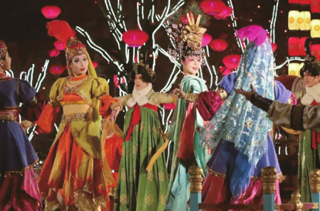 有才華的游客可以在《盛唐密盒》處舉手示意,與演員互動;喜歡李白的游客可以在《詩歌藝術》處與李白 對詩;《花車 斗彩》處西域胡姬與大唐美女現(xiàn)場斗舞,彰顯盛唐時期絲路文化和盛唐文化的和諧交融,仿佛到了古裝電視劇中的上元節(jié);《貞觀之治》處則可感受李世民時期萬國來朝賀的盛世景象;一路有行為藝術,《武士雕刻》《奮斗在路上》《畫中人》《戲演壁畫》等讓人目不暇接,一路走走停停,到達最南端的開元廣場,就可以看一場大唐不夜城場地最大、演員最多、時間最長的表演《再回長安》,感受大詩人白居易回長安的盛大氛圍;開元廣場東側不倒翁小姐姐表演,周圍也圍著很多游客,不遠萬里前來一睹小姐姐美麗的身姿。