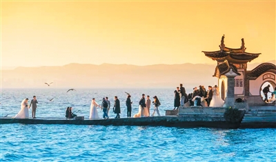 多對新人在云南大理洱海邊拍攝婚紗照。趙 渝攝