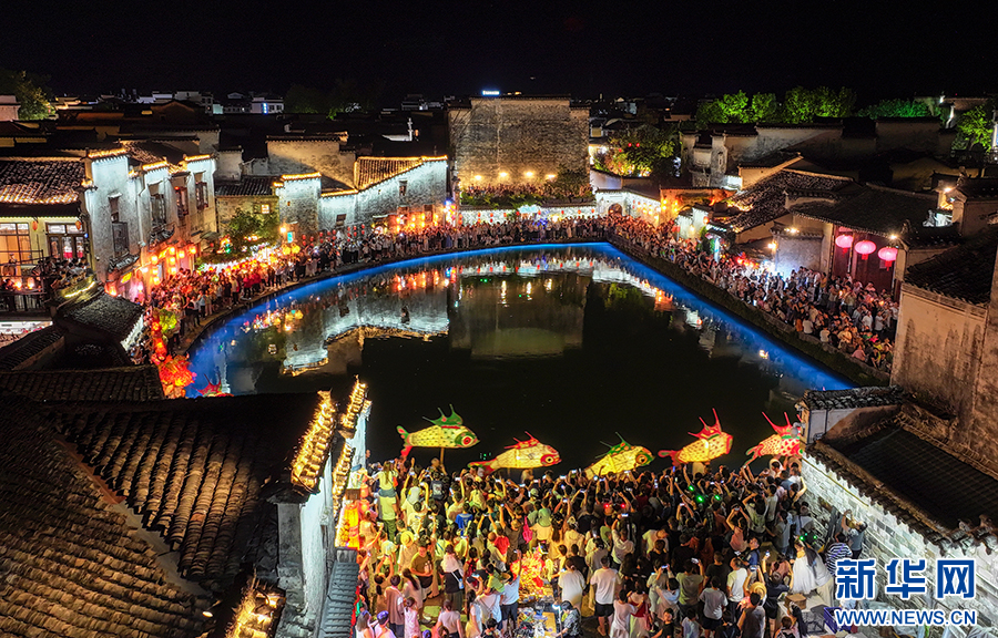 8月13日晚,安徽省黃山市黟縣宏村流光溢彩,花燈夜游表演吸引眾多游客前來參觀、游玩。