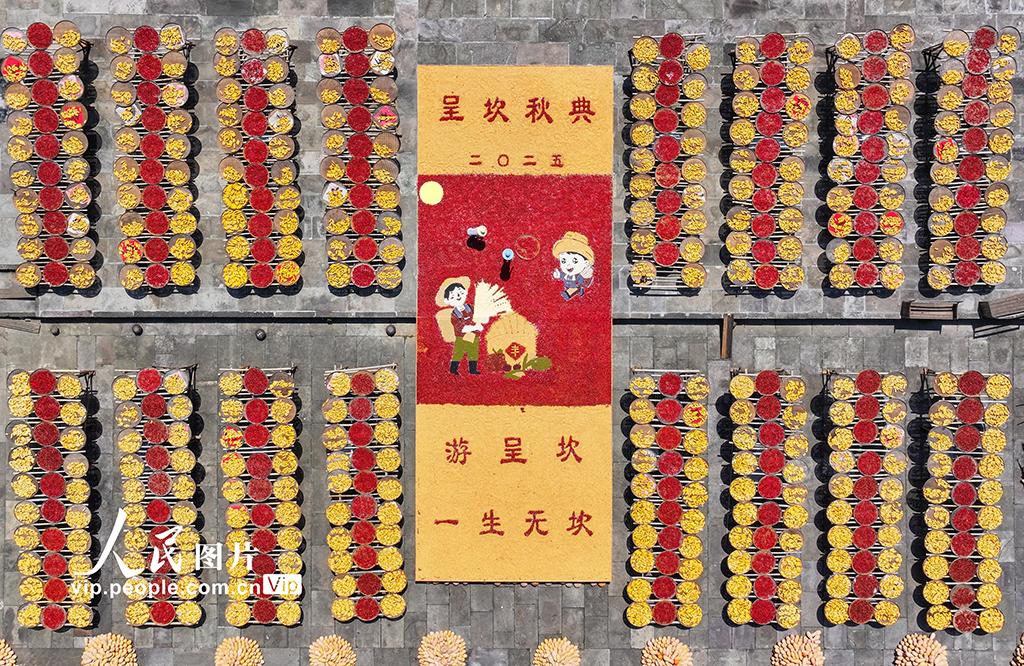 2025年8月18日,安徽省黃山市徽州區(qū)呈坎古村迎來了一年一度的“曬秋”盛景,村民們趁著晴好天氣,將豐收歸倉的玉米、南瓜、紅辣椒等農作物鋪滿曬場,五彩斑斕的農作物與徽派古建交相輝映,構成一幅五谷豐登的秋收畫卷,吸引眾多游客前來感受豐收的喜悅。施亞磊攝(人民圖片網)
