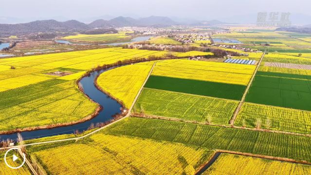 眼下,安徽省池州市東至縣張溪鎮(zhèn)油菜花進入盛花期。從空中俯瞰,金色花海如大地鋪就的錦繡絨毯,與青山、村落、溪流相映成趣,勾勒出一幅詩意盎然的春日田園畫卷。