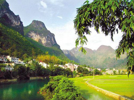 巴馬長(zhǎng)壽村盤(pán)陽(yáng)河逶迤地流淌,串起了一個(gè)個(gè)小村落