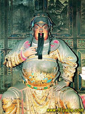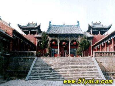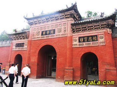 前行有午門.是一座面闊五間,單檐廡殿頂、石雕回廊的廳式建筑。周圍有石欄桿,欄板正反兩面浮雕各類圖案、人物144幅,洋洋大觀,頗有童趣。廳內(nèi)南有周倉、廖化畫像,軒昂威武。北面左右兩側,彩繪著關羽戎馬一生的主要經(jīng)歷,起于桃園三結義,止于水淹七軍,只是沒有走麥城這個情節(jié),在全國關廟壁畫中都按此進行,據(jù)說這是因忌諱關羽自高自大而被殺,終于造成蜀國的覆滅而隱去的。穿過午門,經(jīng)“山海鐘靈”坊、御書樓,便是關帝廟主體建筑崇寧殿。