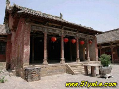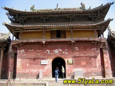 山門最古,為金時原構(gòu),五開間,兩層,下層磚砌高臺,中柱上裝青石門框及板門,門框上線刻花紋,圖案秀美。上層施平座及勾欄,粱架現(xiàn)整簡潔,結(jié)構(gòu)已具元代爬梁的雛形。屋頂琉璃為明代補(bǔ)制,鮮麗勁秀。這種高臺以上的門廡或殿宇,見宇敦煌壁畫,實物中少有。
