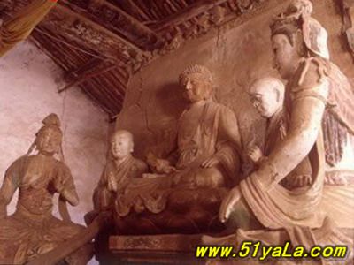 寺前有藏式佛塔一座,高約25米,明代所筑。寺內(nèi)南殿和正殿兩座,均經(jīng)后世修補(bǔ),唯殿內(nèi)塑像和碑刻仍是唐、宋原物。南殿3間,內(nèi)置彩塑12尊,中為釋迦、文殊、普賢、阿難、迦葉,兩側(cè)有觀音、羅漢、韋馱、脅侍、供養(yǎng)人等,造像風(fēng)格與青蓮寺宋代塑像如出一轍。殿內(nèi)《硤石寺大陪遠(yuǎn)法師遺跡記》唐碑一通,寶歷元年(825年)鐫造,碑頭線刻彌勒講經(jīng)圖,山門、圍廊、佛殿、講壇莫不具備,是研究唐代建筑布局和形制的形象資料。正殿內(nèi)佛壇寬大,上置彩塑7軀,釋迦、文殊、普賢、二弟子及二供養(yǎng)菩薩,皆為唐制,面形豐滿,肌肉健美,身式微屈,姿態(tài)自然。