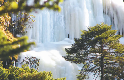 在著名的三疊泉瀑布前,原本飛流直下三千尺的壯觀場面不見了,呈現(xiàn)在游客眼前的是一條巨大的玉帶倒掛在崖壁上。險峻的石巖上,已是懸崖百丈冰,不少參差不齊的冰凌懸掛在石巖上,往日桀驁不馴的瀑布此時變得溫馴了。整個山澗白茫茫一片,被晶瑩剔透的冰柱所覆蓋,銀裝素裹,氣勢恢宏,場面極為壯觀。此時雖聽不到往昔轟隆隆的瀑布聲,但能一睹這懸掛在石崖上的冰瀑,卻是別有一番景致。