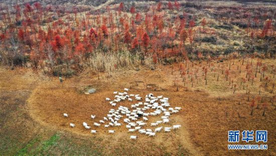 11月27日,牧歸的羊群行走在紅杉林中(無人機(jī)拍攝)。