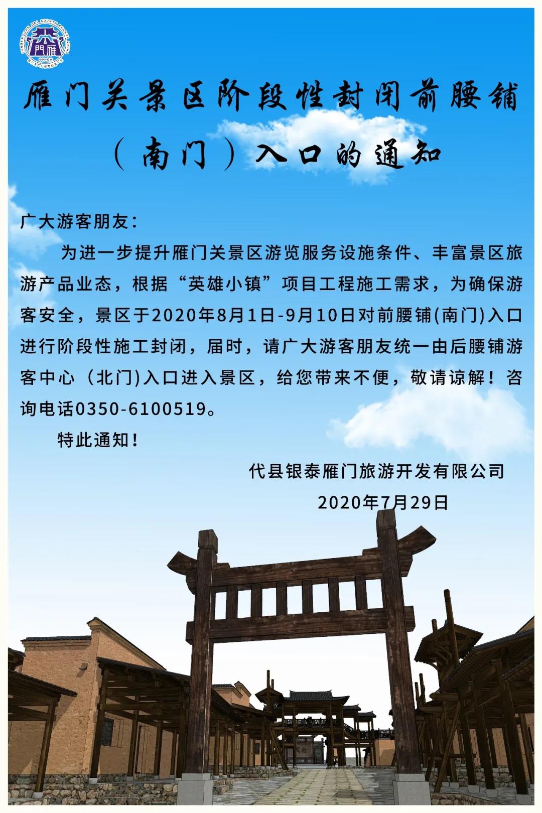 為進一步提升雁門關(guān)景區(qū)游覽服務(wù)設(shè)施條件、豐富景區(qū)旅游產(chǎn)品業(yè)態(tài),根據(jù)“英雄小鎮(zhèn)”項目工程施工需求,為確保游客安全,景區(qū)于2020年8月1日-9月10日對前腰鋪(南門)入口進行階段性施工封閉,屆時,請廣大游客朋友統(tǒng)一由后腰鋪游客中心(北門)入口進入景區(qū),給您帶來不便,敬請諒解!咨詢電話0350-6100519。