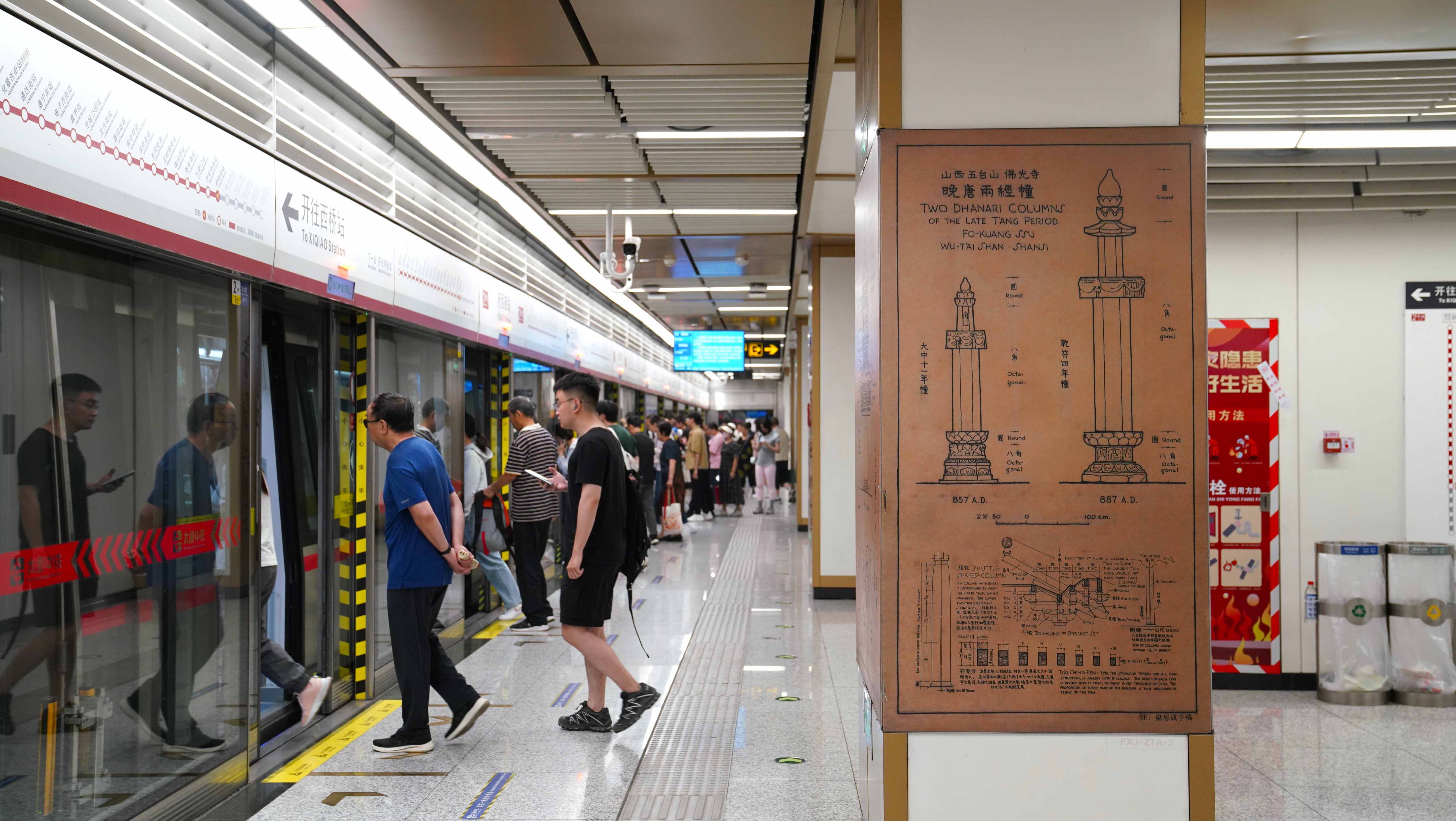 連永樂宮壁畫的絢麗、云岡石窟大佛的莊嚴、應縣木塔的精巧,都被藝術復刻在站廳里——等車的間隙,有人會盯著壁畫上的飛天出神,有人會摸著梁思成筆下的古塔紋路發(fā)呆,匆忙的通勤路,忽然就多了份文化的滋養(yǎng)。