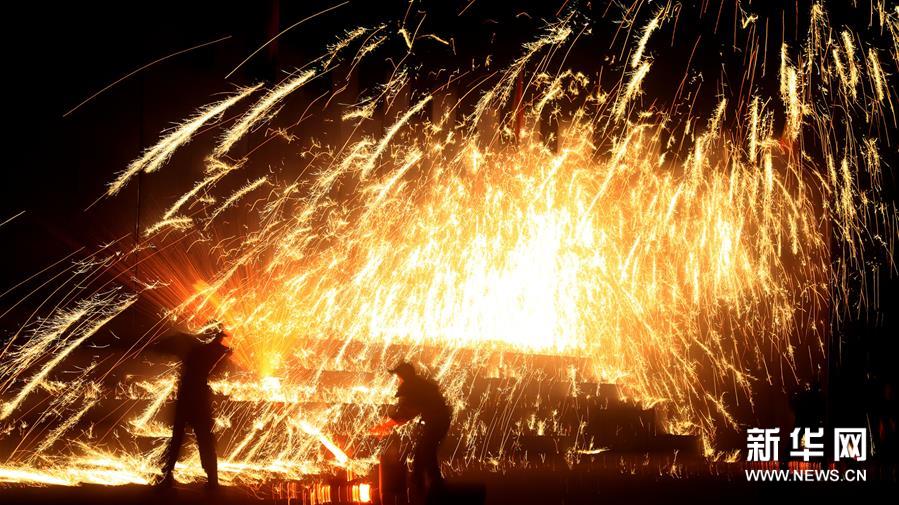 1月12日,河北磁縣開始舉行“打鐵花”慶新年活動(dòng)?!按蜩F花”是以小煉鐵爐將生鐵化成鐵水后,用木板將鐵水加鋸末打上天空,鋸末在空中燃燒形成“鐵花火雨”四濺飛揚(yáng)的景象。打鐵花”是當(dāng)?shù)貧v史悠久的民俗娛樂活動(dòng)。新華社發(fā) (趙鴻宇 攝)