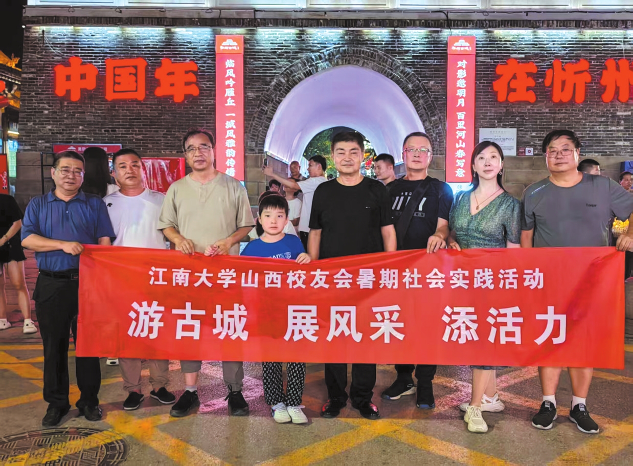 夏日的傍晚,落日熔金,忻州古城城樓如剪影般佇立,與暮色深沉交融。校友們沿著石板路緩緩前行,沿街仿古建筑的恢宏氣勢深深地吸引著大家。夜幕下的古樓在彩燈的映照下更顯雄偉,校友們撐起“游古城展風(fēng)采添活力”的紅色會(huì)標(biāo)合影留念,鏡頭記錄下了我們相聚的寶貴瞬間。