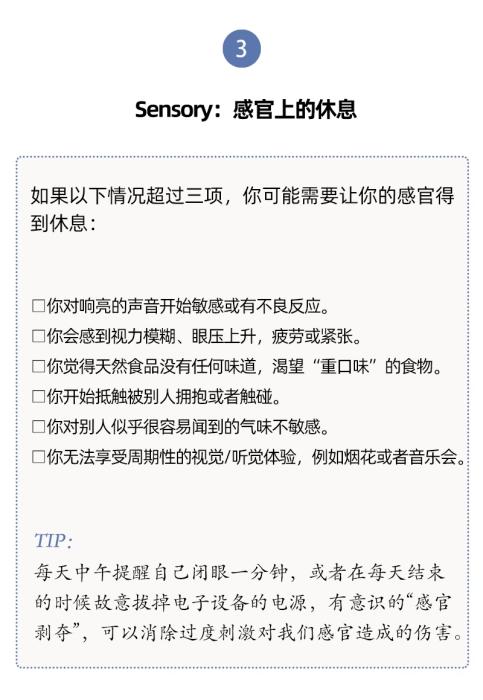 人們對于休息有不同層面的需要,休息與每一天的生活息息相關(guān)。單靠某一個(gè)具體的假期、某一種具體的活動(社交或者睡覺),并不能讓我們恢復(fù)到完全休息好了的狀態(tài)。