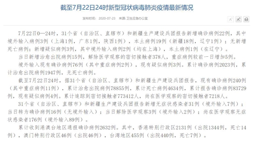 人民網(wǎng)北京7月23日電(董童)國家衛(wèi)生健康委于今日在官網(wǎng)發(fā)布的《截至7月22日24時新型冠狀病毒肺炎疫情最新情況》(以下簡稱“情況”)提出,7月22日0—24時,31個省(自治區(qū)、直轄市)和新疆生產(chǎn)建設兵團報告新增確診病例22例,其中境外輸入病例3例(上海1例,廣東1例,陜西1例),本土病例19例(新疆18例,遼寧1例);無新增死亡病例;新增疑似病例3例,其中境外輸入病例2例(均在上海),本土病例1例(在遼寧)。當日新增治愈出院病例15例,解除醫(yī)學觀察的密切接觸者378人,重癥病例較前一日增加5例。