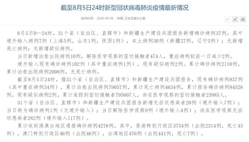 人民網(wǎng)北京8月6日電(董童)國(guó)家衛(wèi)生健康委于今日在官網(wǎng)發(fā)布的《截至8月5日24時(shí)新型冠狀病毒肺炎疫情最新情況》(以下簡(jiǎn)稱(chēng)“情況”)提出,8月5日0—24時(shí),31個(gè)省(自治區(qū)、直轄市)和新疆生產(chǎn)建設(shè)兵團(tuán)報(bào)告新增確診病例37例,其中境外輸入病例7例(上海5例,山東1例,陜西1例),本土病例30例(新疆27例,遼寧3例);無(wú)新增死亡病例;無(wú)新增疑似病例。當(dāng)日新增治愈出院病例10例,解除醫(yī)學(xué)觀察的密切接觸者474人,重癥病例較前一日減少2例。