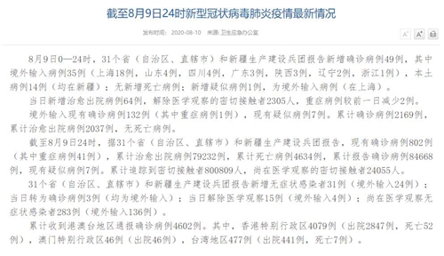 情況顯示,截至8月9日24時(shí),據(jù)31個(gè)省(自治區(qū)、直轄市)和新疆生產(chǎn)建設(shè)兵團(tuán)報(bào)告,現(xiàn)有確診病例802例(其中重癥病例41例),累計(jì)治愈出院病例79232例,累計(jì)死亡病例4634例,累計(jì)報(bào)告確診病例84668例,現(xiàn)有疑似病例7例。累計(jì)追蹤到密切接觸者800809人,尚在醫(yī)學(xué)觀察的密切接觸者24055人。