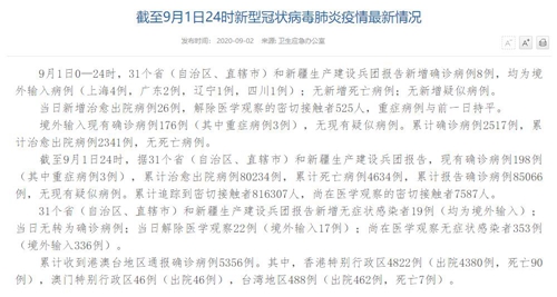 人民網(wǎng)北京9月2日電(董童)國(guó)家衛(wèi)生健康委于今日在官網(wǎng)發(fā)布的《截至9月1日24時(shí)新型冠狀病毒肺炎疫情最新情況》(以下簡(jiǎn)稱(chēng)“情況”)提出,9月1日0—24時(shí),31個(gè)?。ㄗ灾螀^(qū)、直轄市)和新疆生產(chǎn)建設(shè)兵團(tuán)報(bào)告新增確診病例8例,均為境外輸入病例(上海4例,廣東2例,遼寧1例,四川1例);無(wú)新增死亡病例;無(wú)新增疑似病例。當(dāng)日新增治愈出院病例26例,解除醫(yī)學(xué)觀(guān)察的密切接觸者525人,重癥病例與前一日持平。