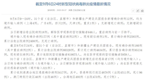 | 國家衛(wèi)健委:9月6日新增確診病例12例 均為境外輸入病例 |