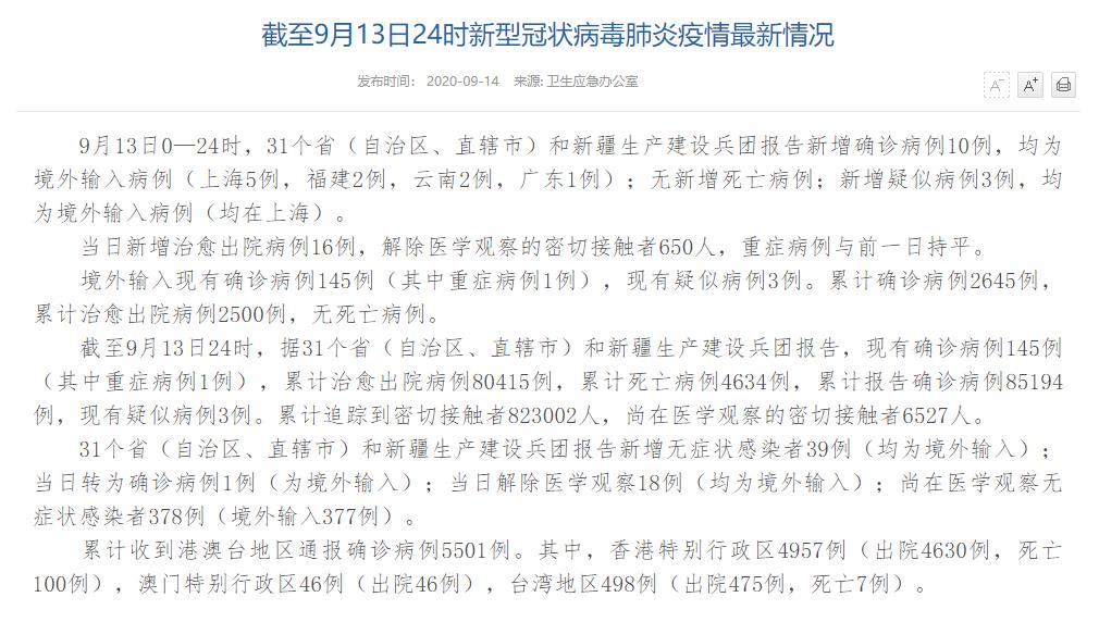 人民網北京9月14日(董童)國家衛(wèi)生健康委于今日在官網發(fā)布的《截至9月13日24時新型冠狀病毒肺炎疫情最新情況》(以下簡稱“情況”)提出,9月13日0—24時,31個省(自治區(qū)、直轄市)和新疆生產建設兵團報告新增確診病例10例,均為境外輸入病例(上海5例,福建2例,云南2例,廣東1例);無新增死亡病例;新增疑似病例3例,均為境外輸入病例(均在上海)。當日新增治愈出院病例16例,解除醫(yī)學觀察的密切接觸者650人,重癥病例與前一日持平。
