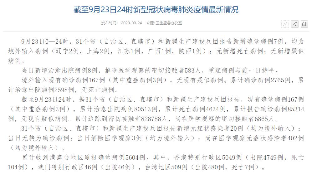 截至9月23日24時,據(jù)31個?。ㄗ灾螀^(qū)、直轄市)和新疆生產(chǎn)建設(shè)兵團報告,現(xiàn)有確診病例167例(其中重癥病例3例),累計治愈出院病例80513例,累計死亡病例4634例,累計報告確診病例85314例,無現(xiàn)有疑似病例。累計追蹤到密切接觸者828788人,尚在醫(yī)學觀察的密切接觸者6865人。
