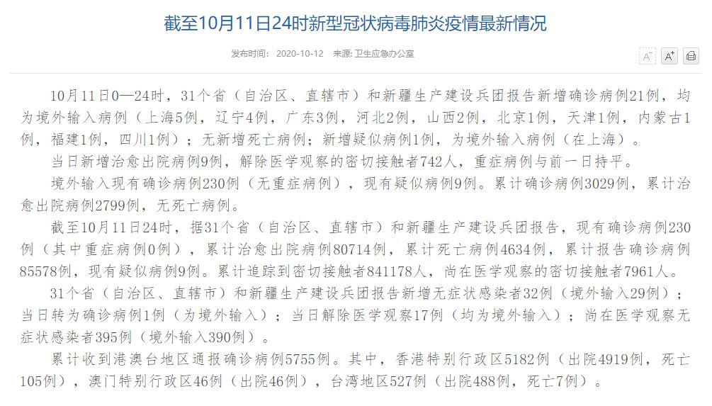 國家衛(wèi)健委:10月11日新增確診病例21例 均為境外輸入病例
