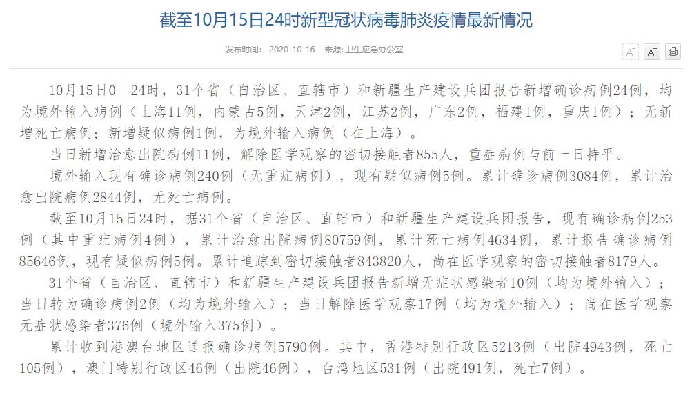 人民網(wǎng)北京10月16日電(董童)國家衛(wèi)生健康委于今日在官網(wǎng)發(fā)布的《截至10月15日24時新型冠狀病毒肺炎疫情最新情況》(以下簡稱“情況”)提出,10月15日0—24時,31個?。ㄗ灾螀^(qū)、直轄市)和新疆生產(chǎn)建設(shè)兵團報告新增確診病例24例,均為境外輸入病例(上海11例,內(nèi)蒙古5例,天津2例,江蘇2例,廣東2例,福建1例,重慶1例);無新增死亡病例;新增疑似病例1例,為境外輸入病例(在上海)。當(dāng)日新增治愈出院病例11例,解除醫(yī)學(xué)觀察的密切接觸者855人,重癥病例與前一日持平。
