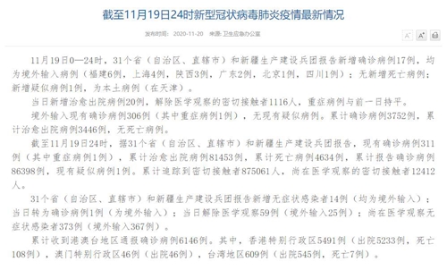 情況顯示,截至11月19日24時(shí),據(jù)31個(gè)?。ㄗ灾螀^(qū)、直轄市)和新疆生產(chǎn)建設(shè)兵團(tuán)報(bào)告,現(xiàn)有確診病例311例(其中重癥病例1例),累計(jì)治愈出院病例81453例,累計(jì)死亡病例4634例,累計(jì)報(bào)告確診病例86398例,現(xiàn)有疑似病例1例。累計(jì)追蹤到密切接觸者875061人,尚在醫(yī)學(xué)觀察的密切接觸者12412人。