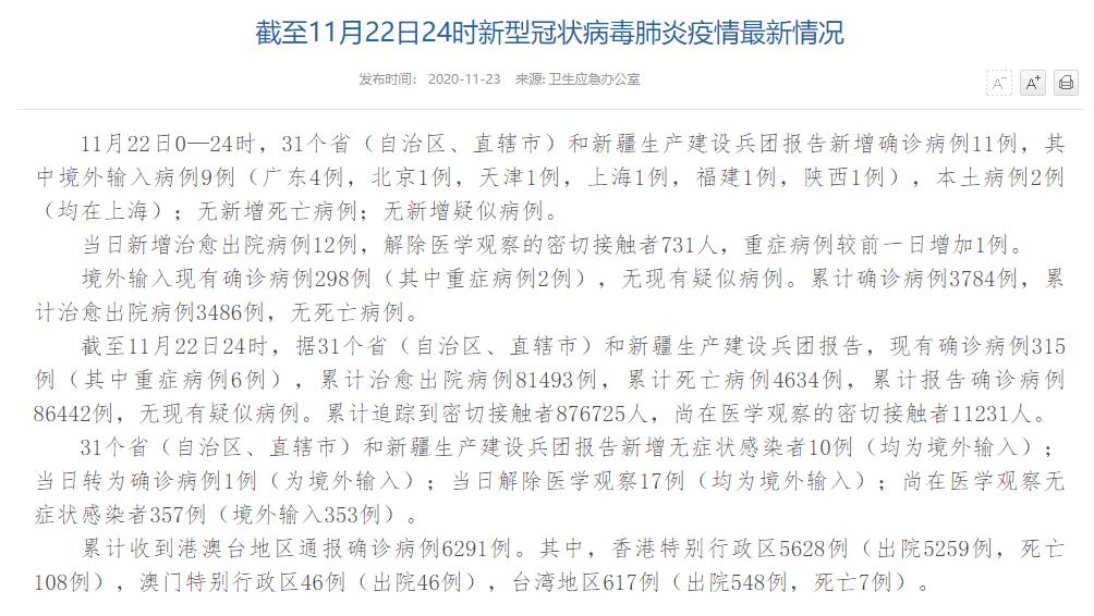 人民網(wǎng)北京11月23日電(董童)國(guó)家衛(wèi)生健康委于今日在官網(wǎng)發(fā)布的《截至11月22日24時(shí)新型冠狀病毒肺炎疫情最新情況》(以下簡(jiǎn)稱(chēng)“情況”)指出,11月22日0—24時(shí),31個(gè)?。ㄗ灾螀^(qū)、直轄市)和新疆生產(chǎn)建設(shè)兵團(tuán)報(bào)告新增確診病例11例,其中境外輸入病例9例(廣東4例,北京1例,天津1例,上海1例,福建1例,陜西1例),本土病例2例(均在上海);無(wú)新增死亡病例;無(wú)新增疑似病例。當(dāng)日新增治愈出院病例12例,解除醫(yī)學(xué)觀察的密切接觸者731人,重癥病例較前一日增加1例。