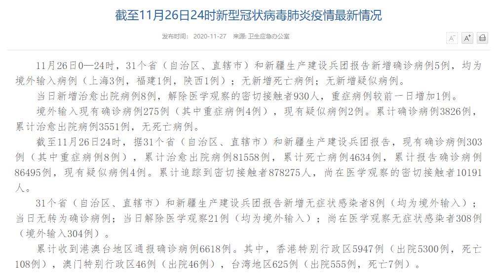 人民網(wǎng)北京11月27日電(董童)國家衛(wèi)生健康委于今日在官網(wǎng)發(fā)布的《截至11月26日24時新型冠狀病毒肺炎疫情最新情況》(以下簡稱“情況”)指出,11月26日0—24時,31個?。ㄗ灾螀^(qū)、直轄市)和新疆生產(chǎn)建設(shè)兵團(tuán)報告新增確診病例5例,均為境外輸入病例(上海3例,福建1例,陜西1例);無新增死亡病例;無新增疑似病例。當(dāng)日新增治愈出院病例8例,解除醫(yī)學(xué)觀察的密切接觸者930人,重癥病例較前一日增加1例。