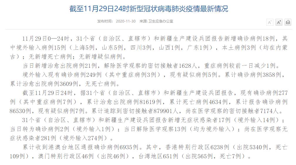 人民網(wǎng)北京11月30日電(董童)國(guó)家衛(wèi)生健康委于今日在官網(wǎng)發(fā)布的《截至11月29日24時(shí)新型冠狀病毒肺炎疫情最新情況》(以下簡(jiǎn)稱(chēng)“情況”)指出,11月29日0—24時(shí),31個(gè)省(自治區(qū)、直轄市)和新疆生產(chǎn)建設(shè)兵團(tuán)報(bào)告新增確診病例18例,其中境外輸入病例15例(上海5例,山東5例,四川3例,山西1例,廣東1例),本土病例3例(均在內(nèi)蒙古);無(wú)新增死亡病例;無(wú)新增疑似病例。當(dāng)日新增治愈出院病例21例,解除醫(yī)學(xué)觀察的密切接觸者1628人,重癥病例較前一日減少1例。