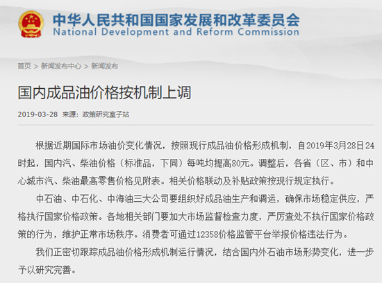 人民網北京3月28日電 (王紹紹) 國家發(fā)改委剛剛發(fā)布通知, 根據近期國際市場油價變化情況,按照現行成品油價格形成機制,自2019年3月28日24時起,國內汽、柴油價格(標準品,下同)每噸均提高80元。調整后,各?。▍^(qū)、市)和中心城市汽、柴油最高零售價格見附表。相關價格聯動及補貼政策按現行規(guī)定執(zhí)行。