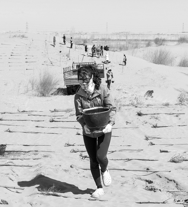 3月31日,一名青年志愿者正在取水澆灌。當日,200余名中韓兩國青年志愿者來到內(nèi)蒙古自治區(qū)達拉特旗庫布其沙漠種樹。2006年起,中國國際青年交流中心與韓國韓中文化青少年協(xié)會組織兩國青年志愿者在庫布其沙漠植樹,參與防沙固沙項目。截至目前已植樹850多萬株,造林3萬多畝。新華社記者劉磊攝