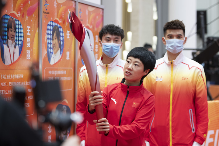 1月5日,北京冬奧會火炬開始在黑龍江省進行展示,冬奧會短道速滑冠軍張會(中)在活動現場手持火炬。新華社記者 張濤 攝
