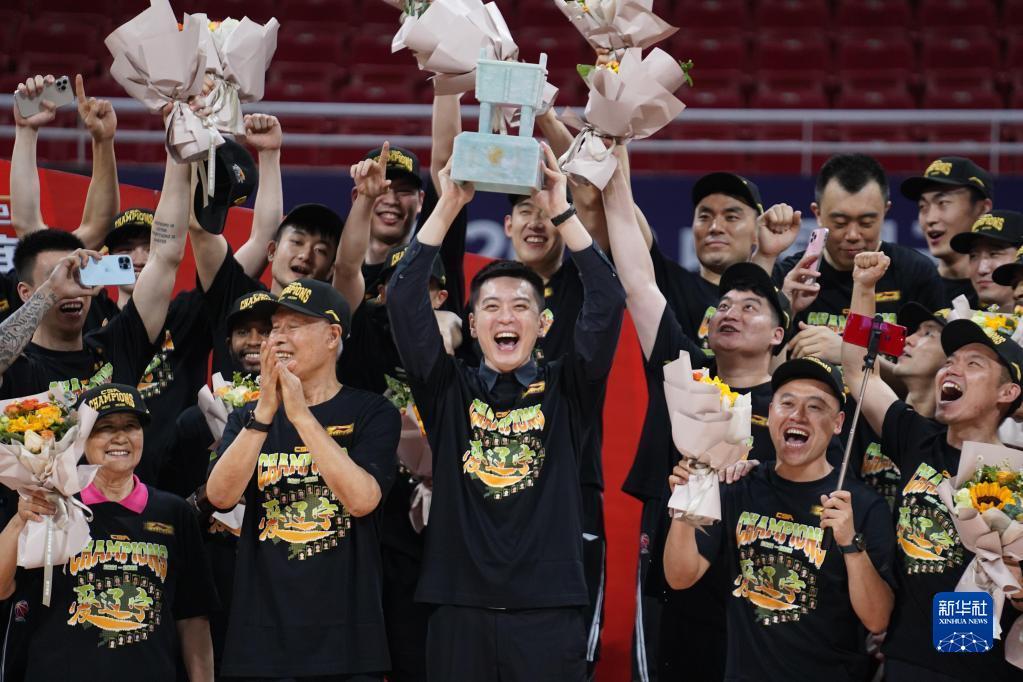 4月26日,遼寧本鋼隊主教練楊鳴(中)手捧冠軍鼎慶祝。新華社記者 周密 攝