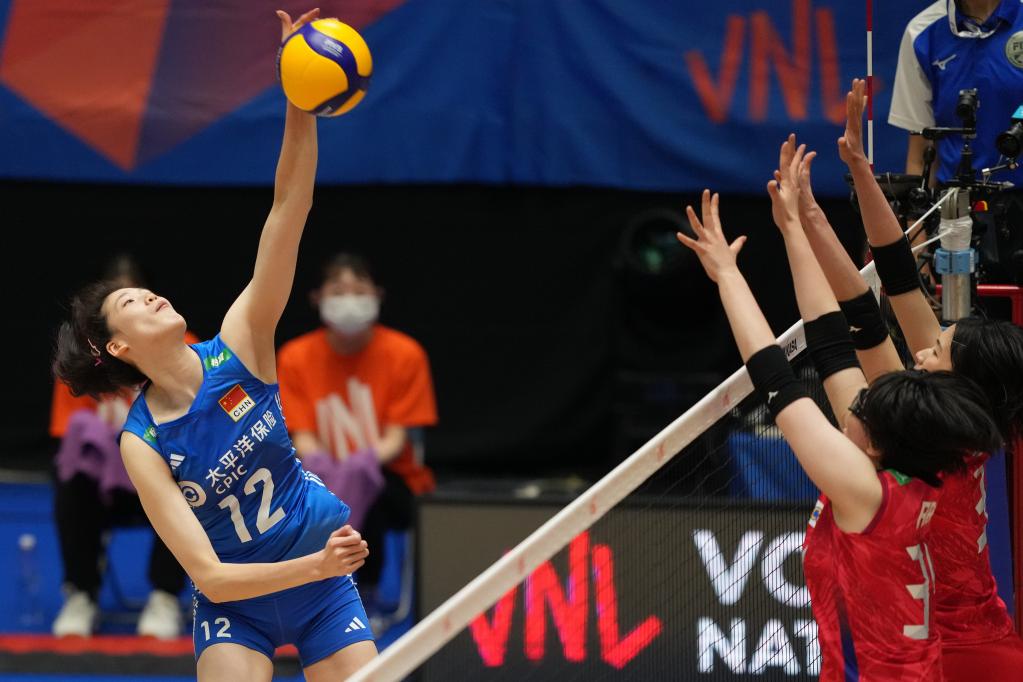 6月4日,中國隊球員李盈瑩(左)在比賽中扣球。新華社記者 張笑宇 攝