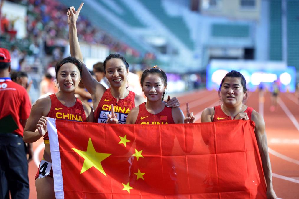 7月12日,中國(guó)隊(duì)選手葛曼棋、韋永麗、梁小靜和袁琦琦(從左至右)在女子4×100米接力決賽后合影。新華社發(fā)(拉亨攝)