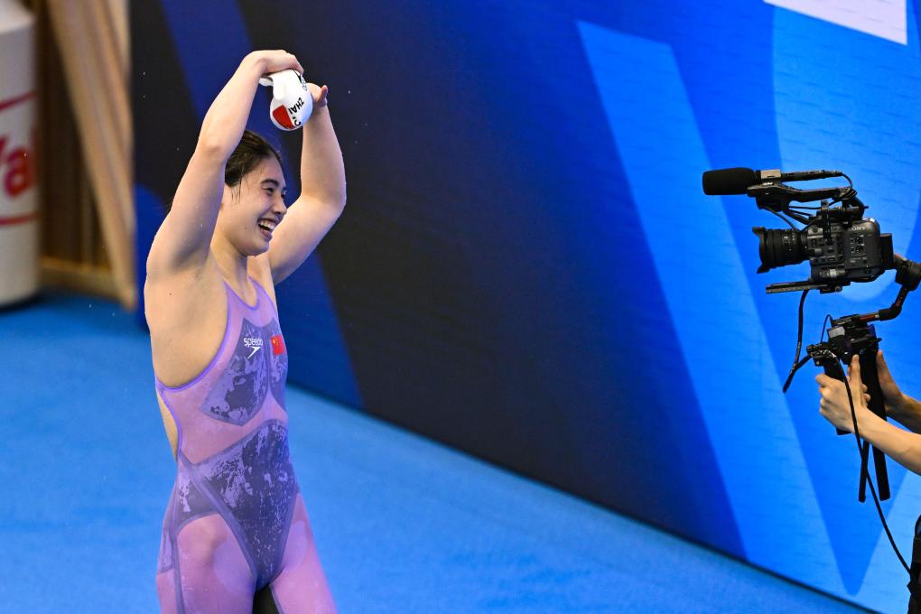 覃海洋摘金短短幾分鐘后,中國蝶泳名將張雨霏在女子100米蝶泳決賽中以56秒12的成績獲得冠軍,如愿以償?shù)財[脫了世錦賽“銅牌專業(yè)戶”的稱呼,奪得個人首枚世錦賽金牌。雖然在東京奧運會拿到200米蝶泳冠軍,但張雨霏在世錦賽上一直不太順利,在2022年布達佩斯世錦賽女子蝶泳從50米到200米三個距離的比賽中全部獲得銅牌。
