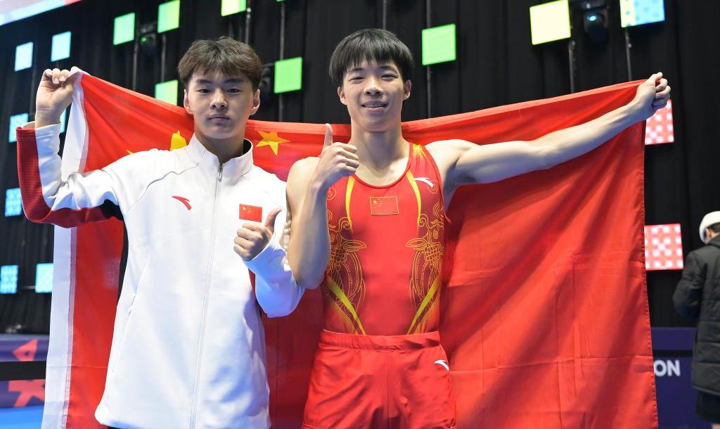11月12日,王梓賽(左)與嚴(yán)浪宇在賽后合影。圖片來自國際體操聯(lián)合會官方社交媒體賬號