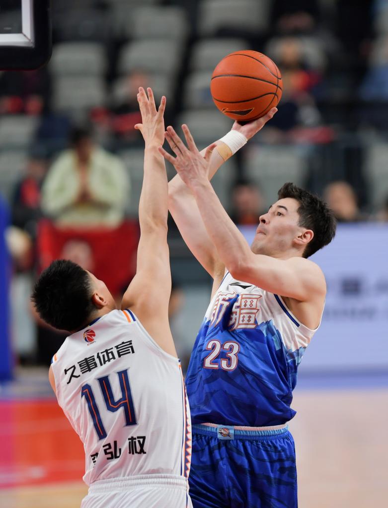 12月20日,新疆隊(duì)球員阿不都沙拉木(右)在比賽中投籃。新華社記者王菲攝