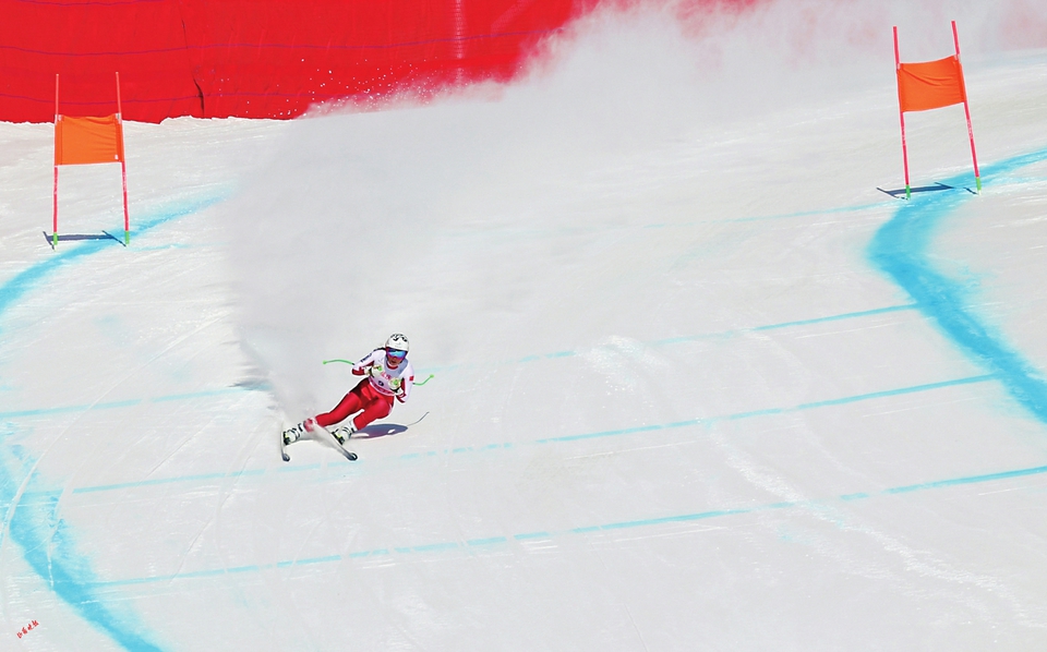 高山之巔,白雪之上,滑雪運動員在落差高達(dá)547米的雪道上滑降,他們穿行、回轉(zhuǎn),快似閃電,如雪上飛燕。
