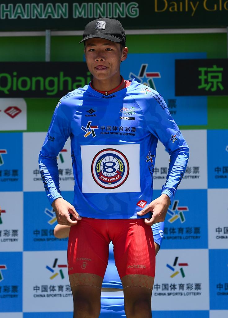 8月27日,巴迪瑞洲際車隊(duì)車手王奎程獲得代表亞洲最佳個(gè)人成績的藍(lán)衫。新華社記者 楊冠宇 攝