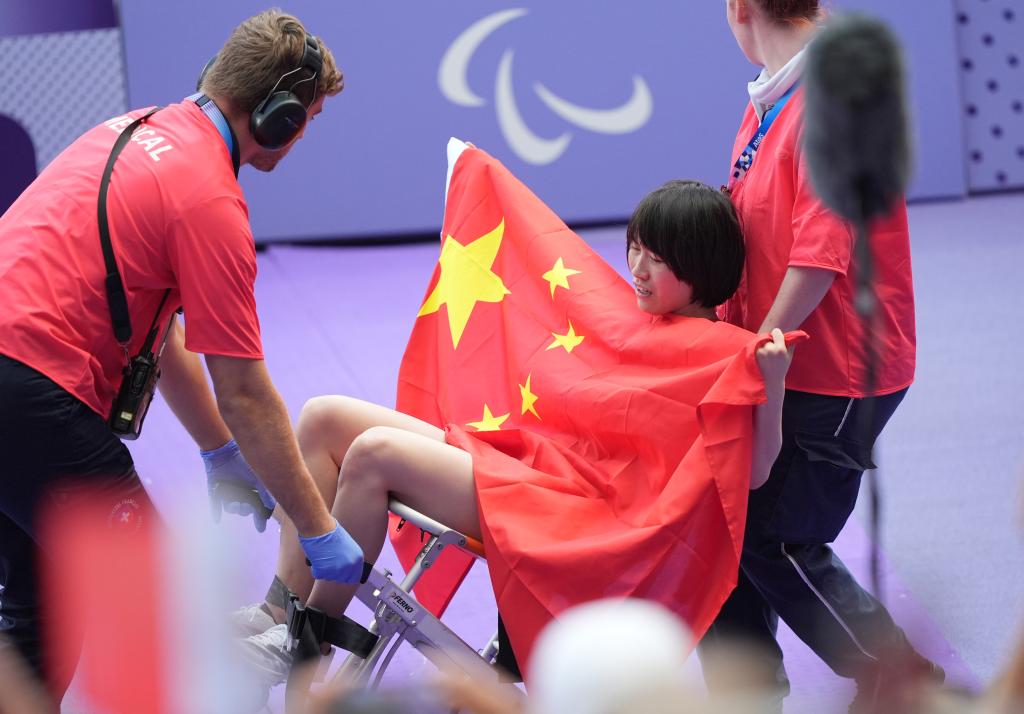 9月1日,中國選手史逸婷賽后在醫(yī)護(hù)人員的幫助下離場(chǎng)。新華社記者 才揚(yáng) 攝
