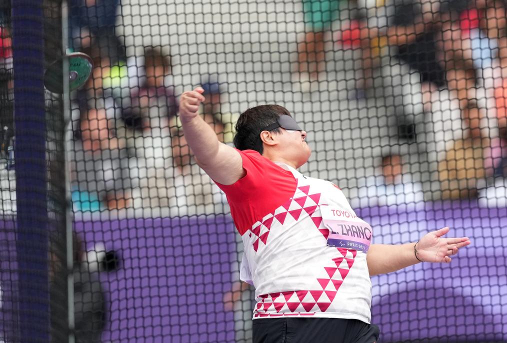 9月3日,張亮敏在比賽中試投。當(dāng)日,在巴黎殘奧會(huì)田徑女子鐵餅F11級(jí)決賽中,中國選手張亮敏以39米08的成績獲得金牌。新華社記者 賀燦鈴 攝
