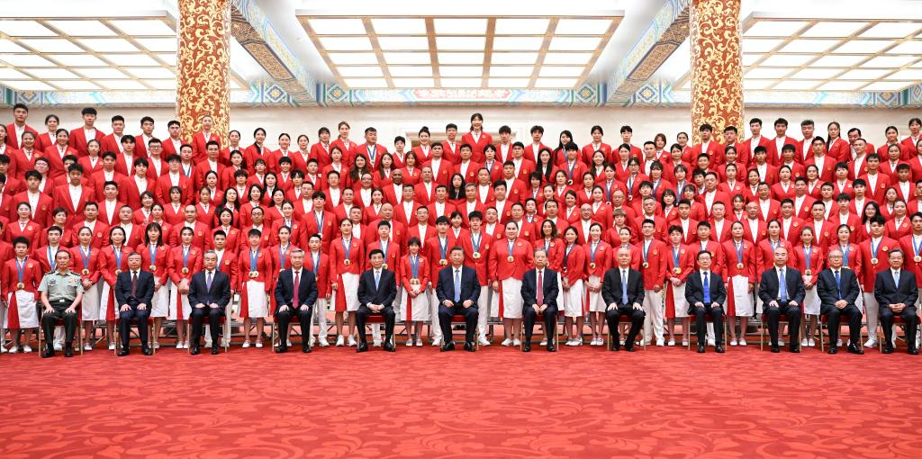 8月20日,黨和國家領(lǐng)導(dǎo)人習(xí)近平、趙樂際、王滬寧、蔡奇、李希、韓正等在人民大會堂接見第33屆夏季奧林匹克運動會中國體育代表團全體成員。新華社記者 謝環(huán)馳 攝