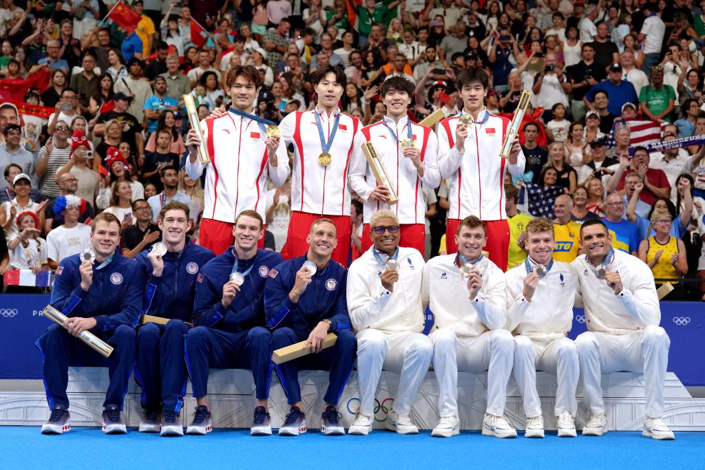 8月4日,冠軍中國隊(上)、亞軍美國隊(下左)、季軍法國隊在巴黎奧運會游泳項目男子4x100米混合泳接力頒獎儀式上。新華社記者 杜宇 攝